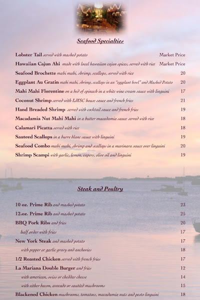 La Mariana Sailing Club beckons diners to explore a world of diverse and delectable culinary experiences. The menu at this Polynesian paradise is a treasure trove of flavors, offering a rich tapestry of dishes and drinks that cater to every palate. From classic Hawaiian delicacies like Ahi Poke and Kalua Pork to American favorites like Loco Moco, the options are as diverse as the island’s landscapes. The bar is a realm of enchanting tiki cocktails, with Mai Tais and Blue Hawaiians transporting guests to a tropical oasis sip by sip.